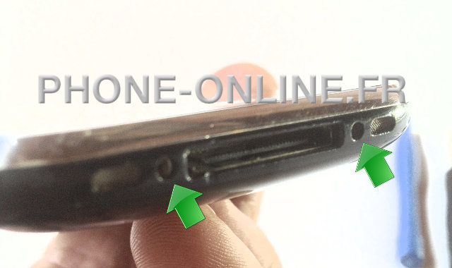 Sur les deux cotés du port de charge (où vous branchez le chargeur de votre iPhone) se trouvent deux visses.